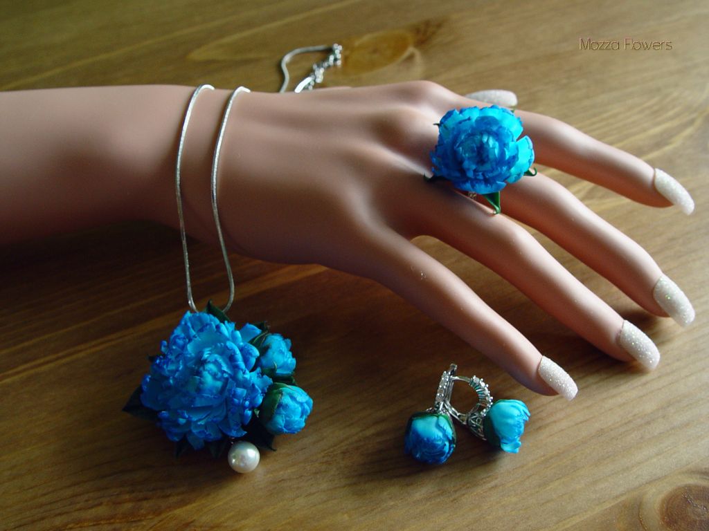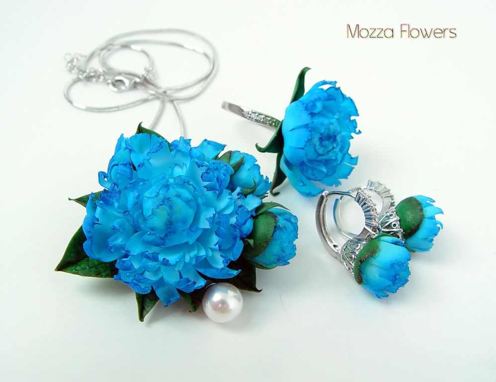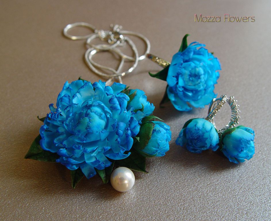 Комплект с синими пионами выполнен полностью вручную, слеплен из полимернойи глины и тонирован масляными красками.