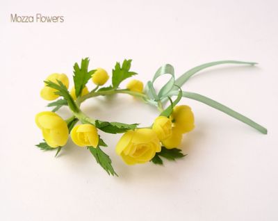Браслет с купавками выполнен полностью вручную, слеплен из самоотвердеваемой полимерной глины и тонирован масляными красками.