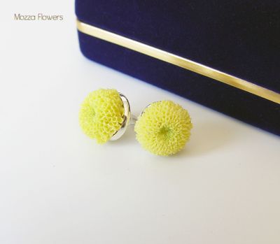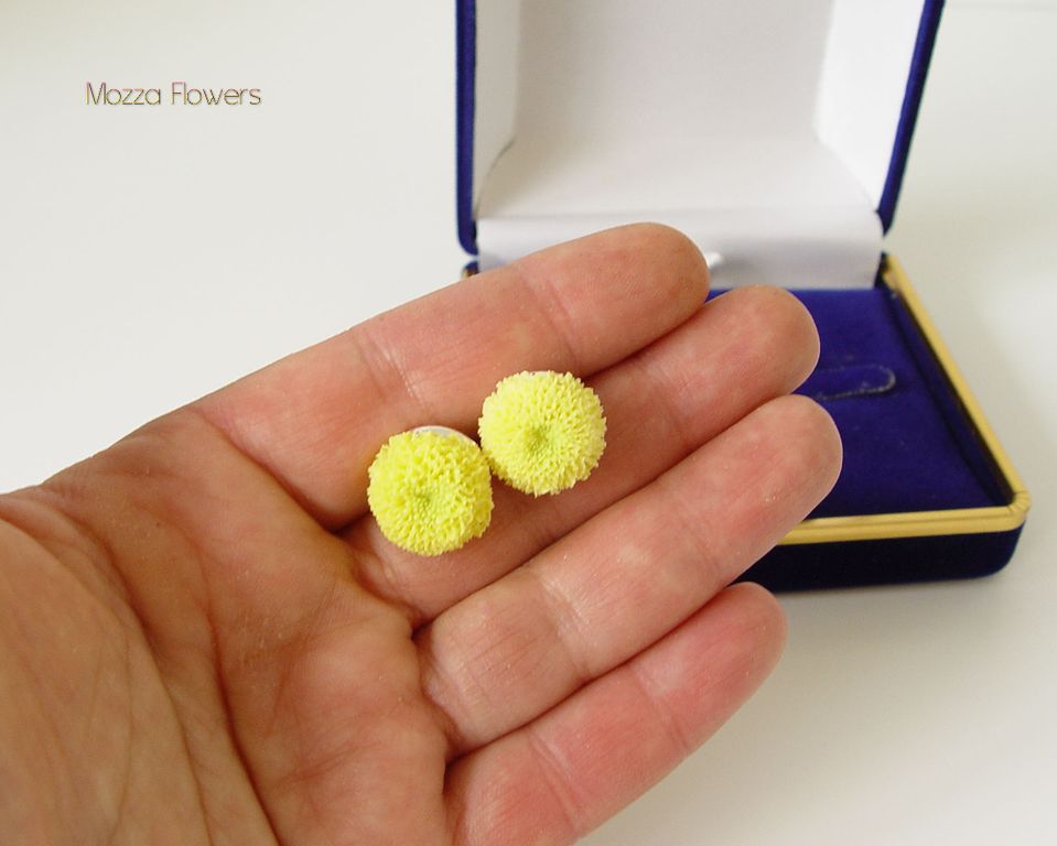 Серьги-гвоздики с желтыми хризантемами выполнены вручную из полимерной глины.