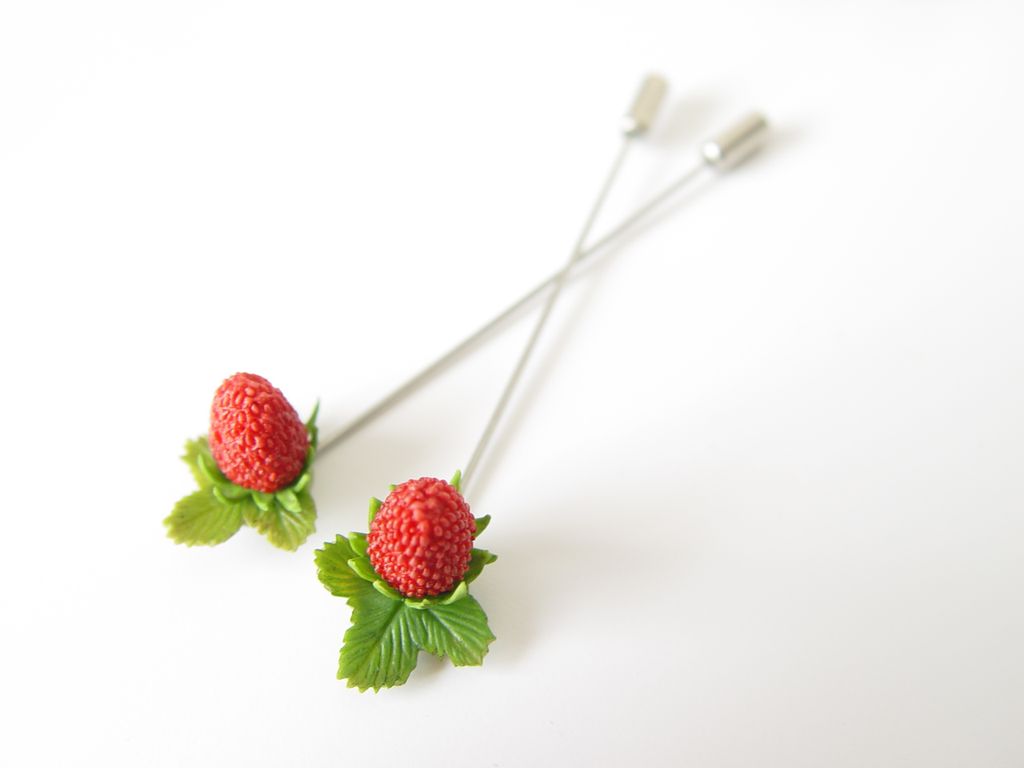 Брошь-игла С земляникой выполнена вручную из полимерной глины.