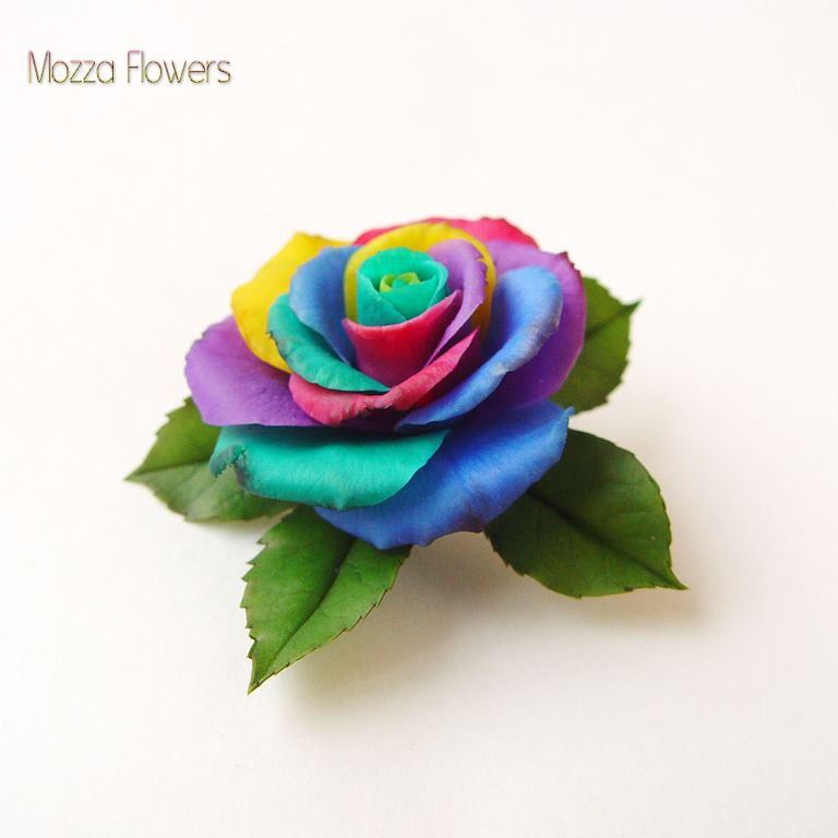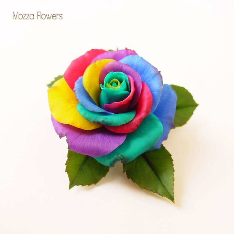 Радужная роза выполнена из полимерной глины полностью вручную.