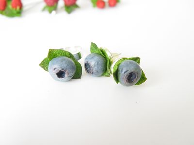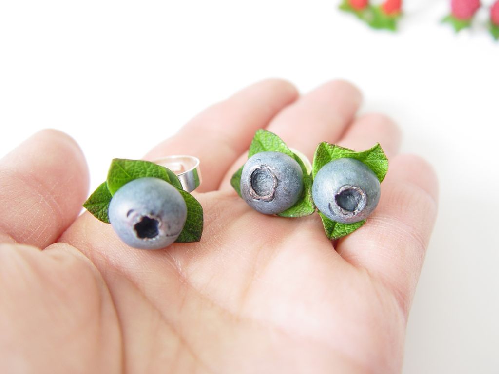 Комплект состоит из сережек-гвоздиков и кольца С голубикой, выполнен вручную из полимерной глины.