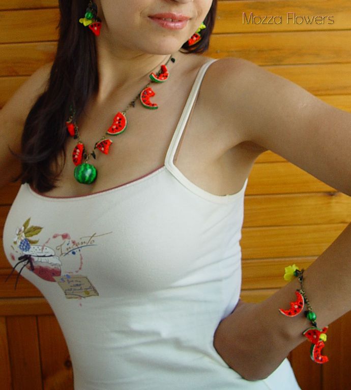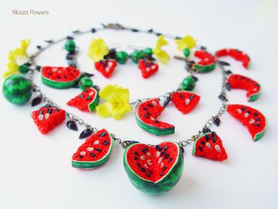 Комплект украшений с арбузами выполнен из полимерной глины(термопластики) полностью вручную.