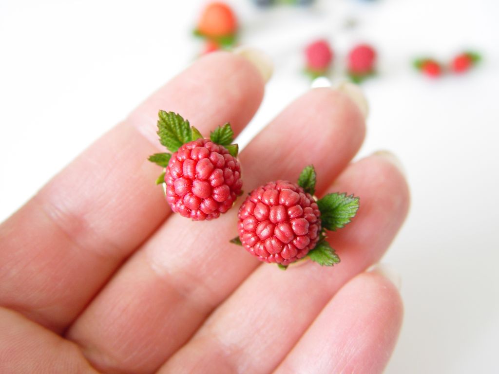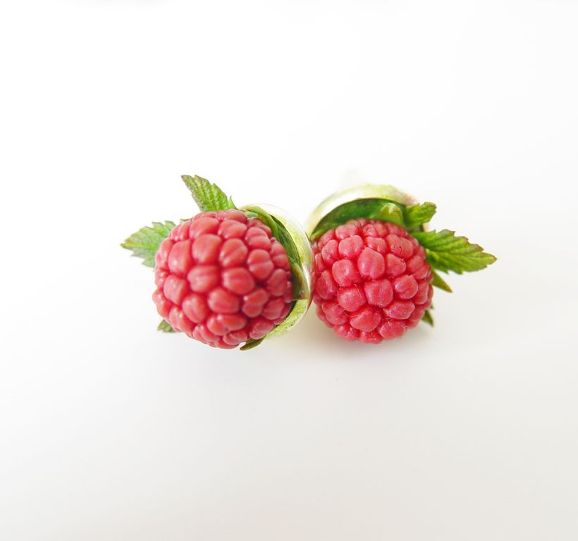 Серьги-гвоздики с малиной выполнены вручную из полимерной глины.